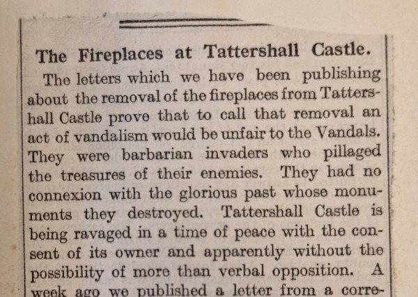 The removal of these medieval fireplaces triggered public outcry. One paper stated, “Tattershall Castle is being ravaged in a time of peace with the consent of its owner and apparently without the possibility of more than verbal opposition.”